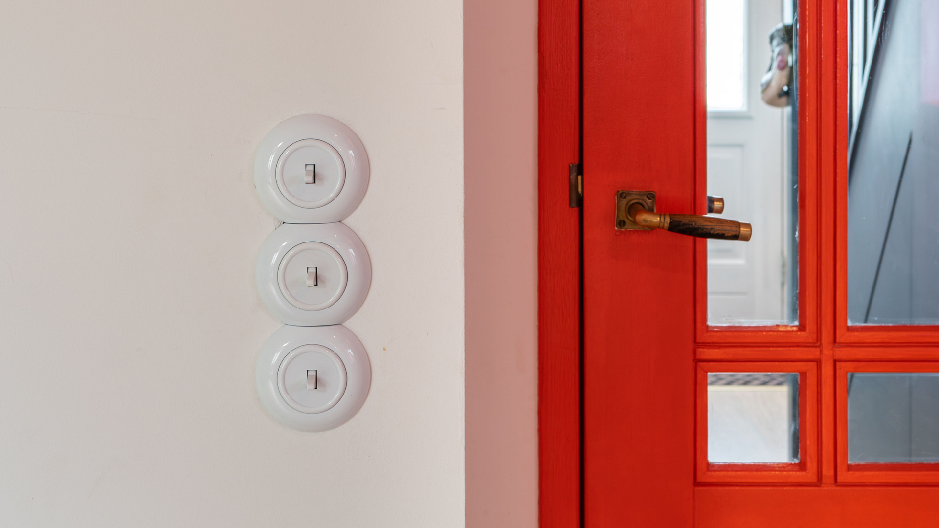 In een huis waar kleur zo’n hoofdrol speelt, vallen details extra op. Daarom kozen Kirsten en haar partner bewust voor schakelmateriaal dat én opgaat in de ruimte, én een subtiel karakter toevoegt. “We werden verliefd op het schakelmateriaal van De Oude Schakelaar” schrijft ze op Instagram. De ronde, op de jaren 30 geïnspireerde vormen passen perfect bij de speelsheid van haar interieur. In plaats van bakeliet kozen ze voor ons eigen merk in kunststof: luchtig, modern, en precies strak genoeg.
