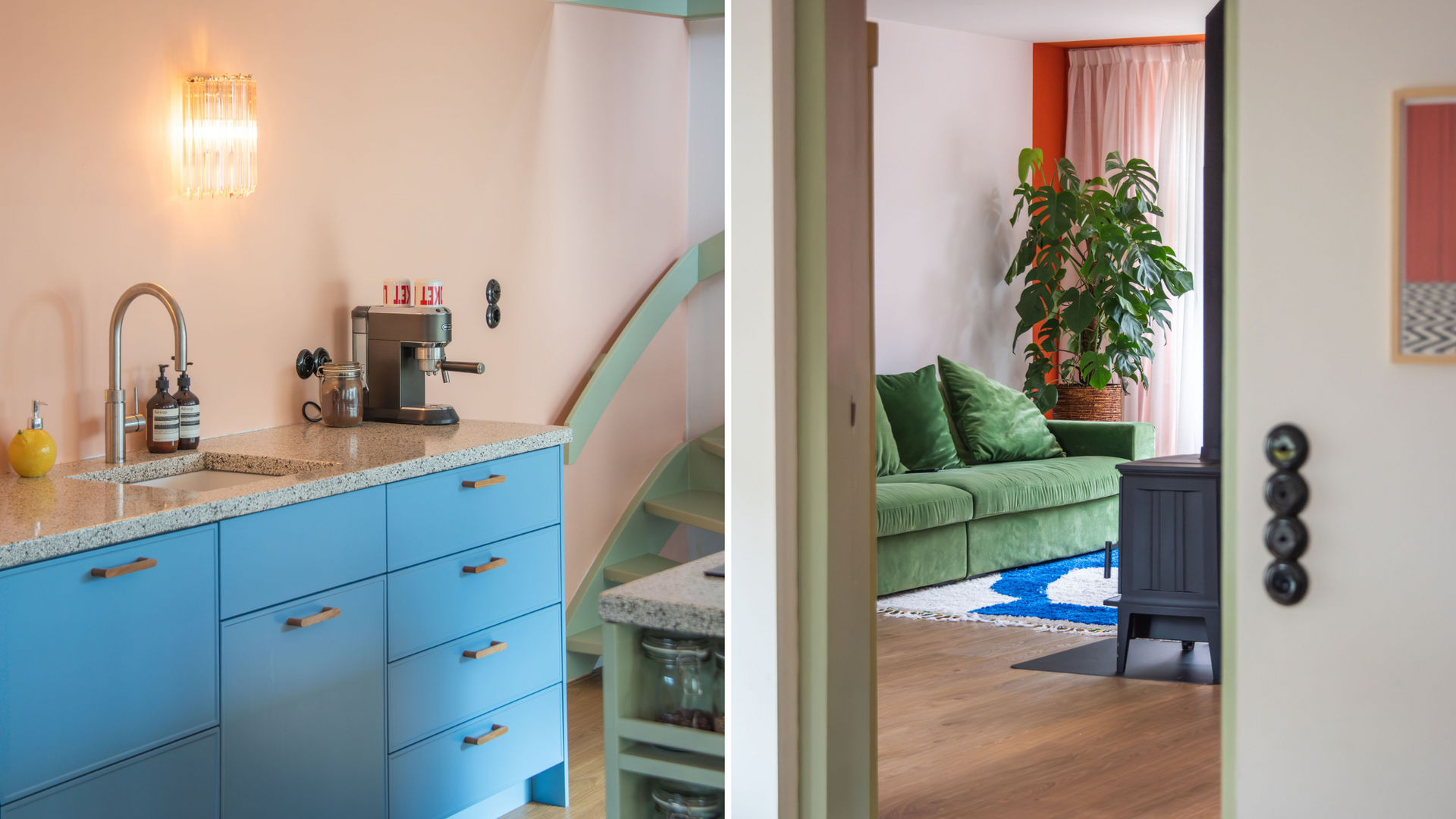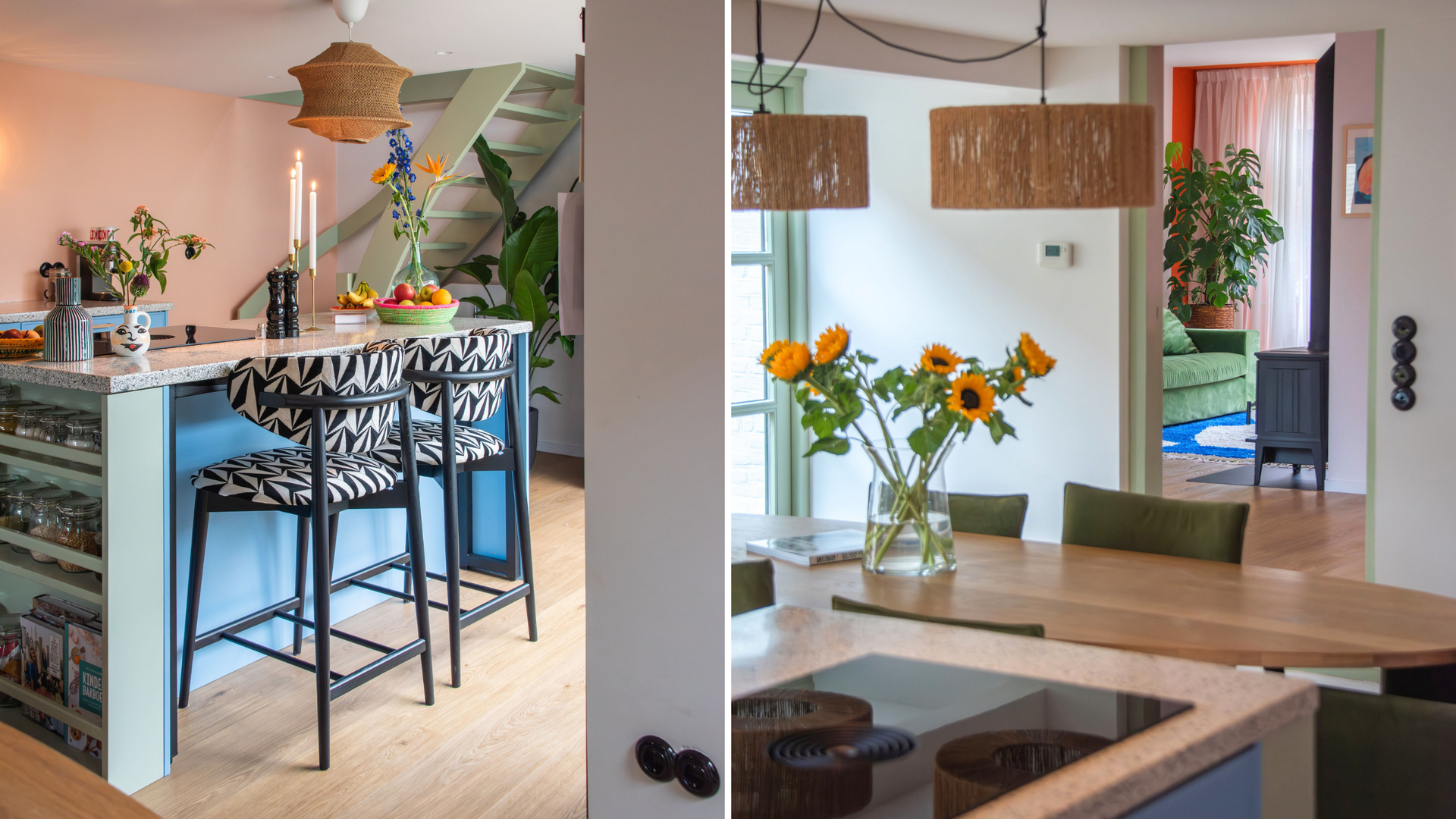 Wie door Kirstens nieuwe huis loopt, ziet meteen één ding: ze durft kleur te gebruiken. En dat geeft het appartement een tintelende vrolijkheid die je niet kunt faken. Roze deuren, een groene bank, frisse lichtblauwe keukenkastjes en een knalroze inbouwkast — het is speels maar toch in balans. De kleuren hebben een bijna filmisch effect: elke hoek is fotogeniek en toch duidelijk bedoeld om in te leven.