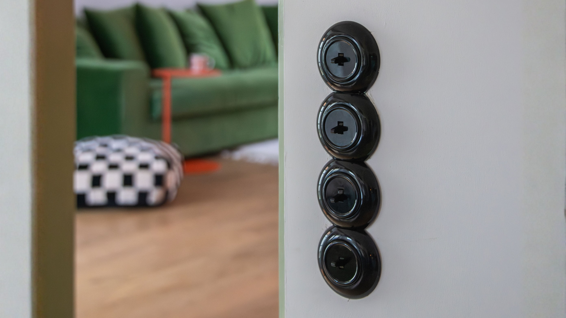 De combinatie van zwarte schakelaars in de meer uitgesproken ruimtes en witte exemplaren op lichte wanden zorgt voor rust én ritme. De ronde afdekramen verzachten het geheel, waardoor zelfs eenvoudige elementen zoals stopcontacten en lichtknoppen naadloos opgaan in het kleurenpalet.
