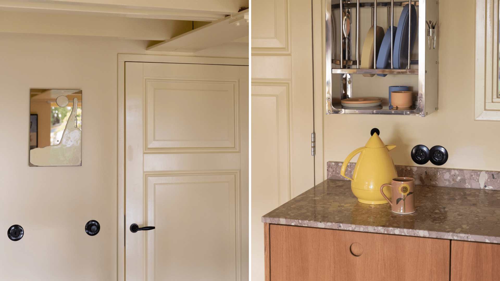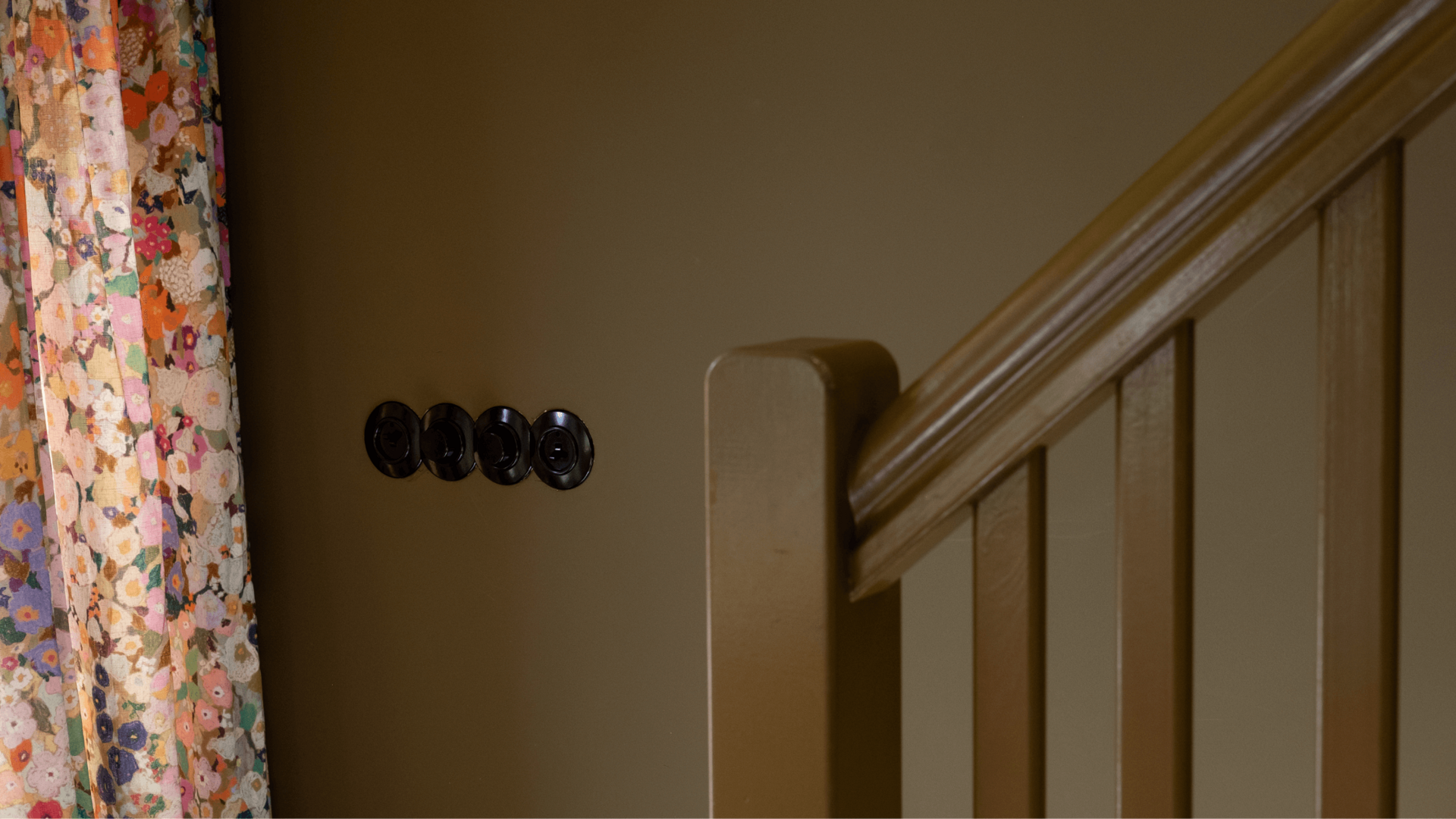 “Je staat er niet bij stil, maar schakelmateriaal zie en gebruik je elke dag,” zegt Nicole. “Bij De Oude Schakelaar vond ik precies wat ik zocht: zwart bakeliet, met ronde vormen die passen bij het retrokarakter van ons huis. Het zijn een soort sieraden voor op de muur — vrolijke ‘dots’ die alles samenbrengen.”