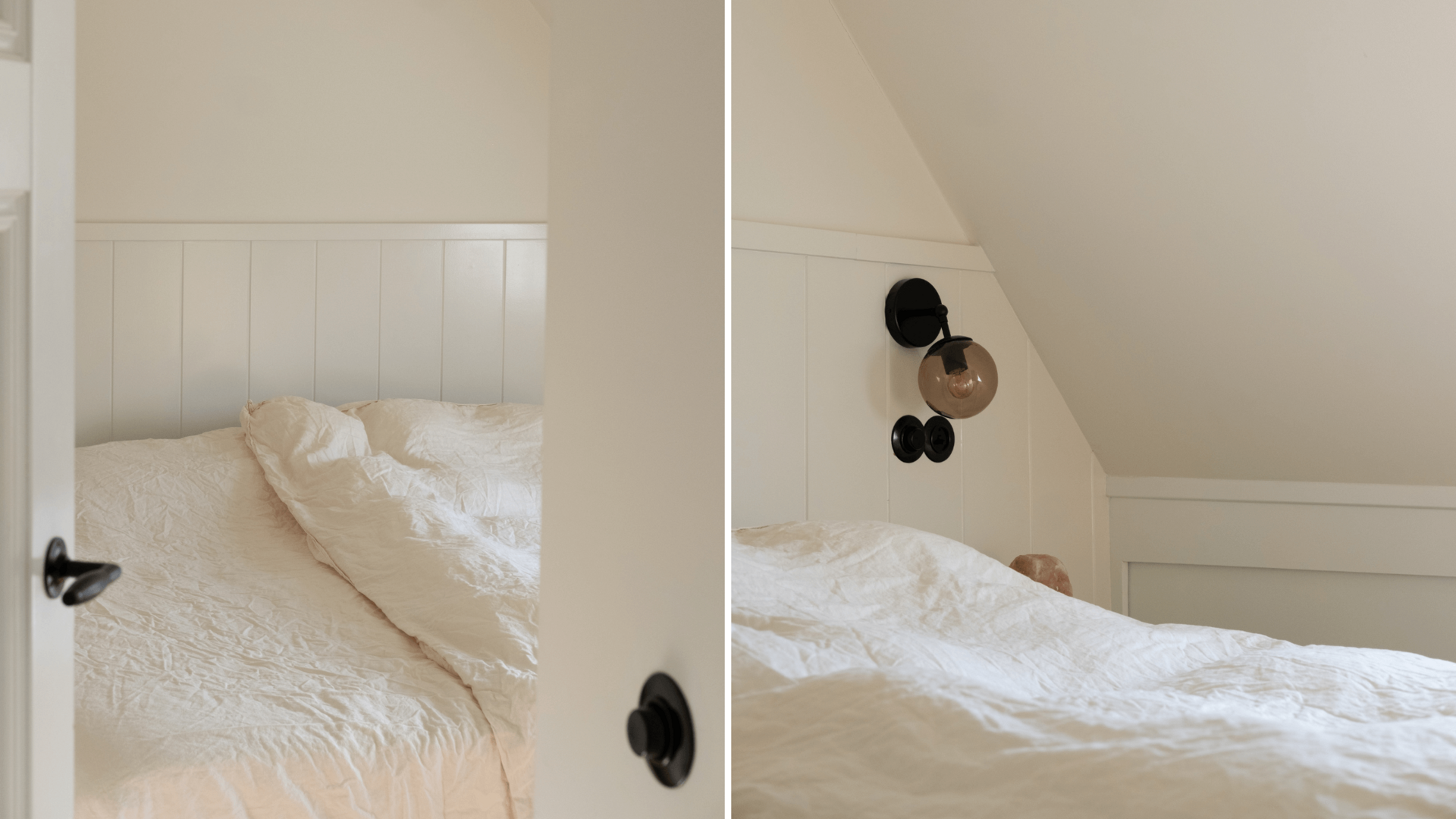 De zwarte bakelieten schakelaars vormen een stoer contrast met de lichte tinten in huis. Ze versterken de charme van de oude details, maar voegen tegelijk iets eigentijds toe.