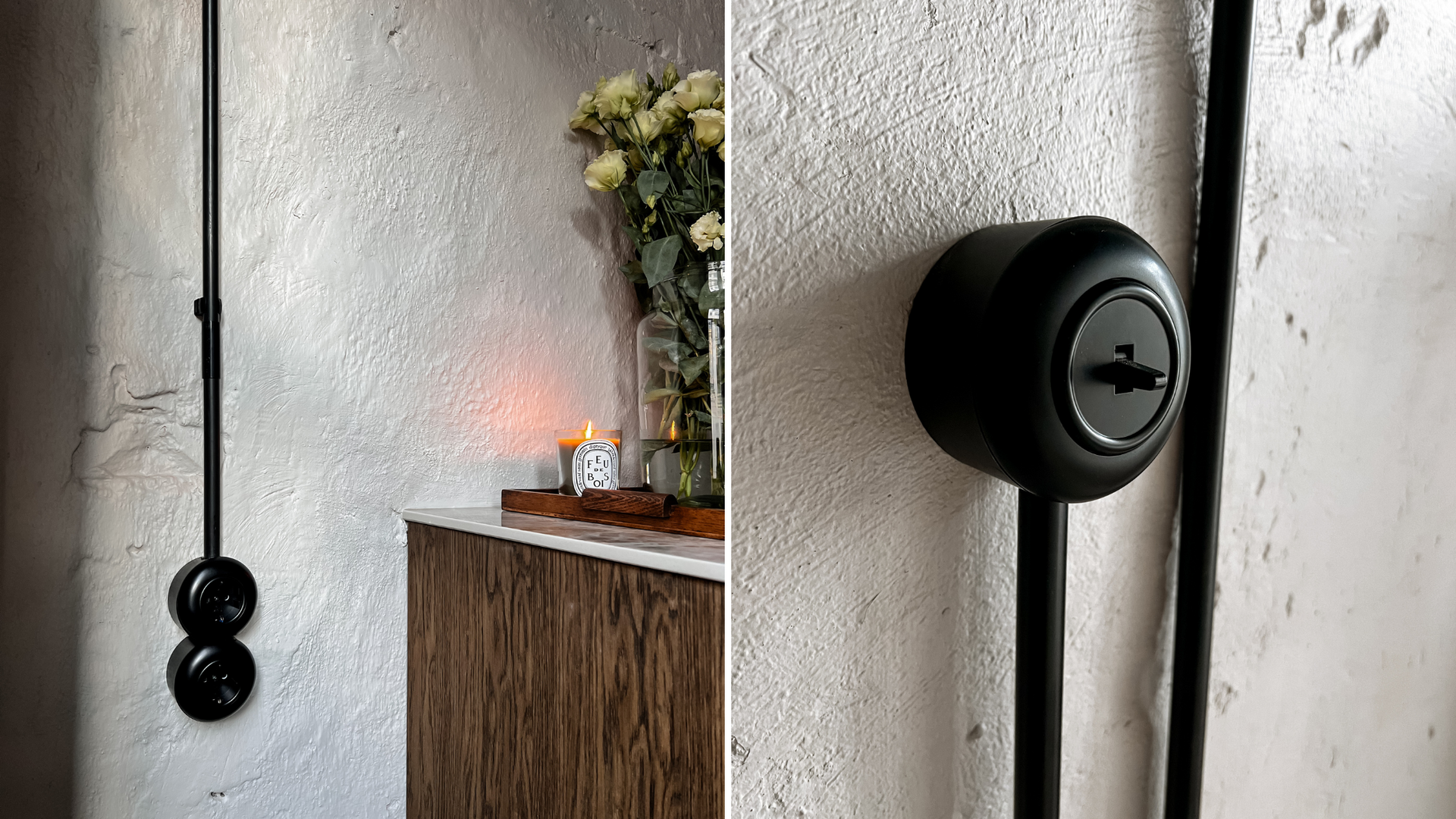 Maar dan nog de keuze: glanzend zwart, wit of mat zwart? Na eindeloos vergelijken en testen tegen het stucwerk werd het mat zwart. Het oogt rustig, chique en sluit mooi aan bij de oude structuur van de muren. Een keuze die niet schreeuwt, maar stilletjes precies goed is. De zwarte kabels lopen zichtbaar over de muren en vormen grafische lijnen die het pand eer aandoen.