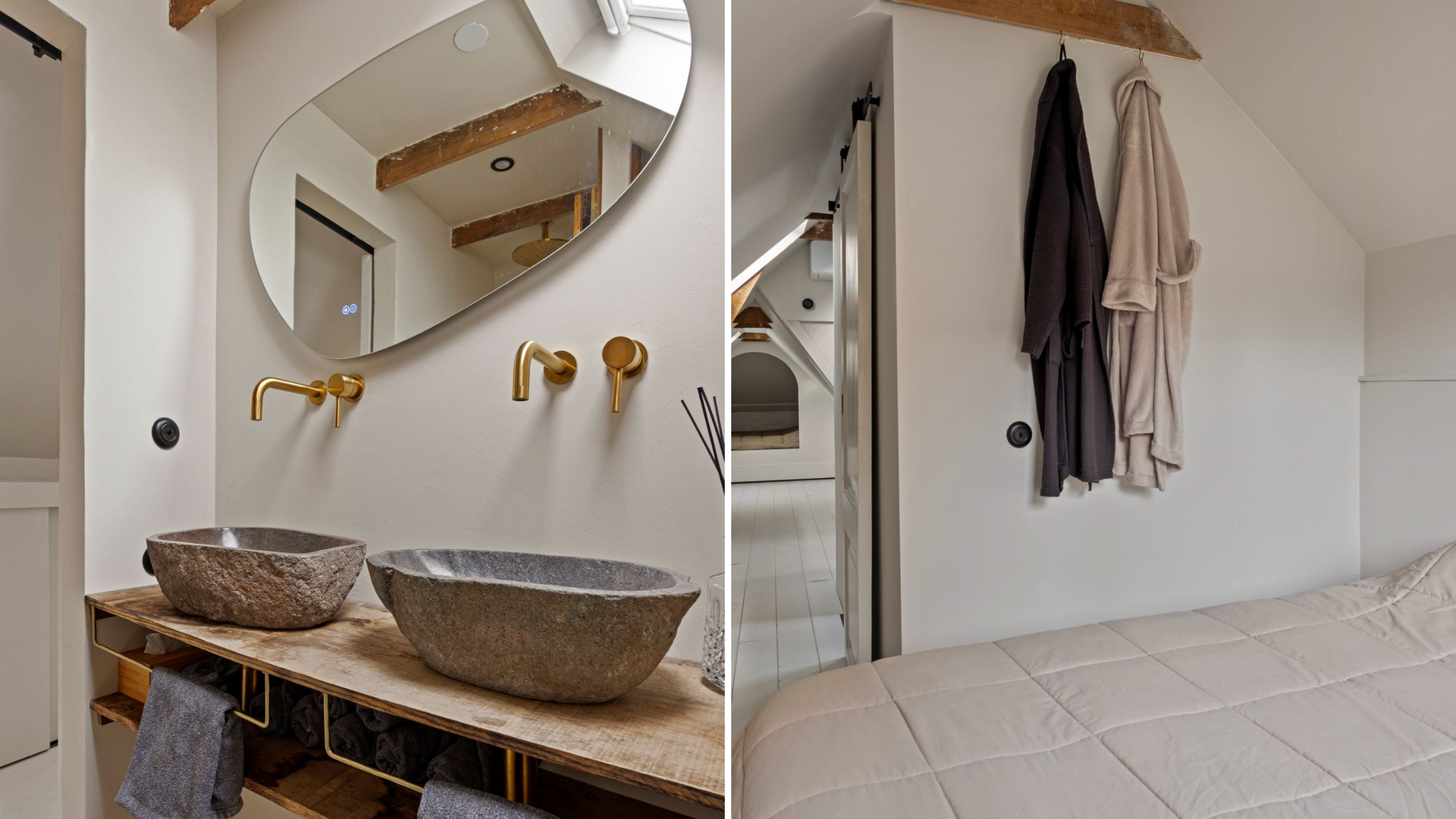 Ondanks de ruwe details — denk aan oude nisjes, zichtbare baksteen en scheve lijnen — voelt het pakhuis warm en uitnodigend. Natuurlijke materialen, zachte tinten en slanke zwarte accenten houden het geheel luchtig. De matzwarte schakelaars en stopcontacten versterken die balans: aanwezig, maar nooit dominant.
