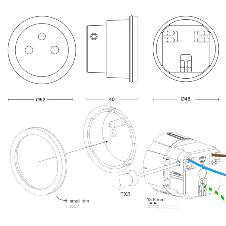 Dit rond stopcontact is inclusief een subtiele metalen smalle rand met een diameter van 52 millimeter. Dit zorgt voor een 100% strakke installatie en de minimalistische uitstraling. De aluminium afwerking zorgt voor een rijk gevoel. Kunststof heeft het nadeel te verkleuren maar deze aluminium rand blijft mooi.