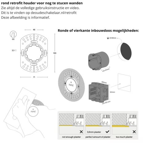 Voor installatie in gestucte of gepleisterde muren gebruik je de retrofit houder. Deze houder wordt in de inbouwdoos geplaatst en meegestuct of gepleisterd met de wand. Klik hier voor meer informatie en een instructievideo van de retrofit houder.